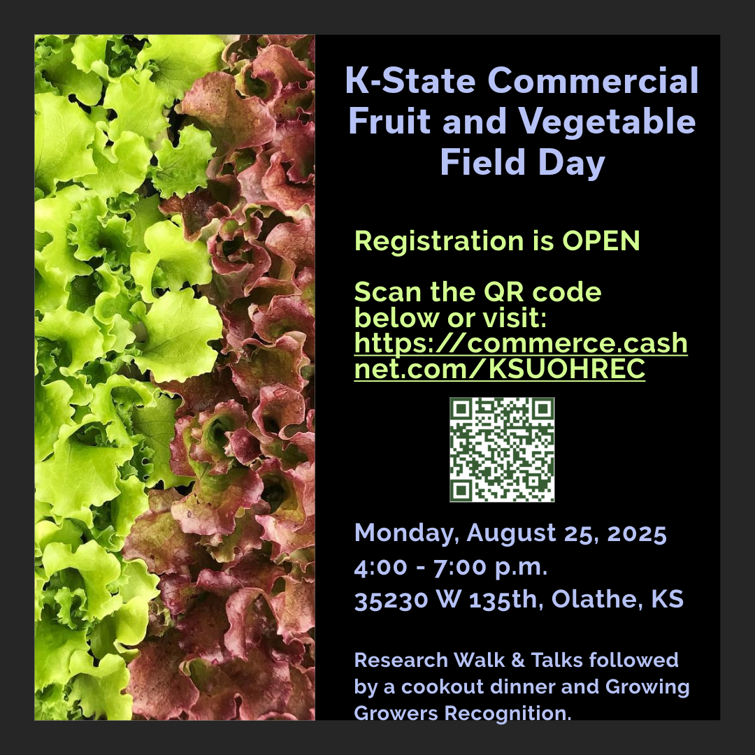 Kansas State University’s Olathe Horticulture Research and Extension Center (OHREC) will host its annual Commercial Fruit and Vegetable Field Day from 4:00-7:00 pm, Monday, August 25, 2025. Field Day features updates on current research projects including tomato, pepper, strawberry, and cantaloupe trials, impact of soil treatments on organic production, posters, and much more. Formal presentations will be followed by a hamburger/veggie burger cookout, featuring vegetables grown at OHREC. The evening will conclude with a recognition ceremony for 2025 Growing Growers Kansas City area apprentices and host farms.