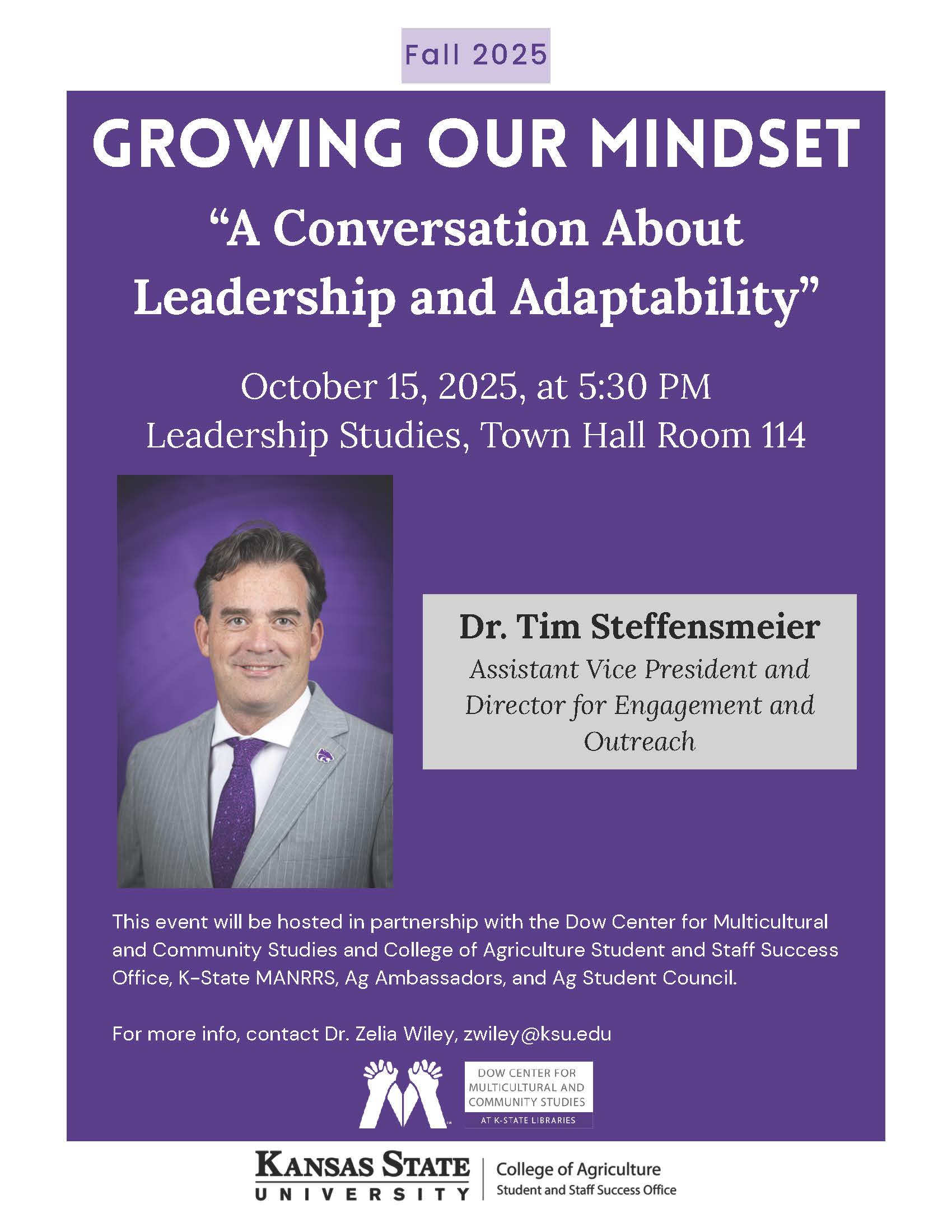 Mark your calendars and please join the College of Agriculture's student leadership and the Student and Staff Success Office in partnership with the Dow Center for Multicultural and Community Studies for the 17th Biannual “Growing our Mindset Professional Development Forum," from 5:30-7:30 pm, Wednesday, October 15, 2025. The featured speaker is Dr. Tim Steffensmeier, K-State Assistant Vice President and Director for Engagement and Outreach, where he will discuss leadership and adaptability within the workforce. The event will be in McVay Family Town Hall (Leadership Studies) room 114. There will be a zoom option.