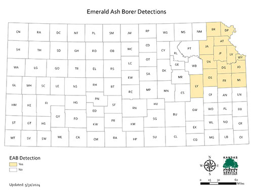 To learn more about where EAB has spread and treatment options for homeowners visit: https://www.kansasforests.org/forest_health/current_pests/emeraldashborer.html.