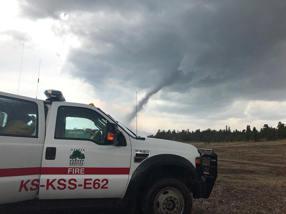 A Kansas Forest Service truck deployed to fight the Weston Pass Fire in Colorado, is forced to pause on July 5 as a tornado passes outside the town of Fairplay. | Download this photo.