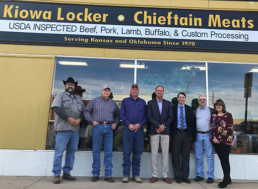 Pictured left to right, Eric Jahay of Barber County Farm Bureau; Rodney Cunningham and Craig Rankin of the Barber County Cattlemen’s Association; Mark Buck, superintendent of USD 254; Mylo Miller superintendent of USD 255; and Rick and Belinda Hitchcock of Chieftain Brand Meats/Kiowa Locker System gathered recently to celebrate their partnership in helping facilitate a program that donates beef to schools for students' lunches. (Photo courtesy of Justin Goodno) | Download this photo