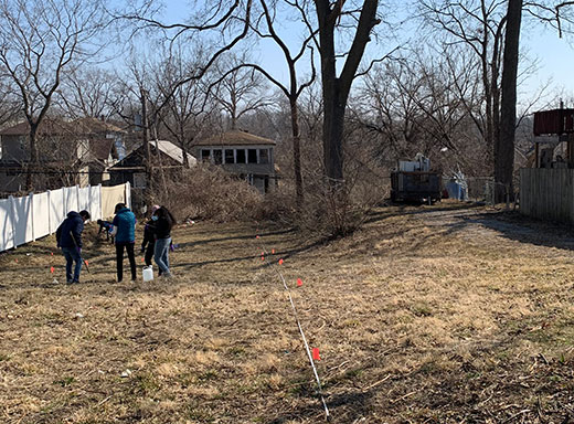 K-State graduate students collect soil samples in a Kansas City neighborhood leading up to a study on how to stabilize lead in soils and minimize exposure to humans. | Download this photo.